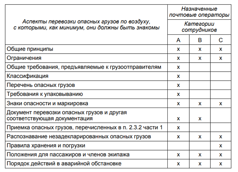 Сотрудники назначенных почтовых операторов должны проходить подготовку, соответствующую выполняемым им обязанностям. Темы, с которыми должны быть знакомы различные категории сотрудников, указаны в таблице 1-4 ТИ ИКАО.